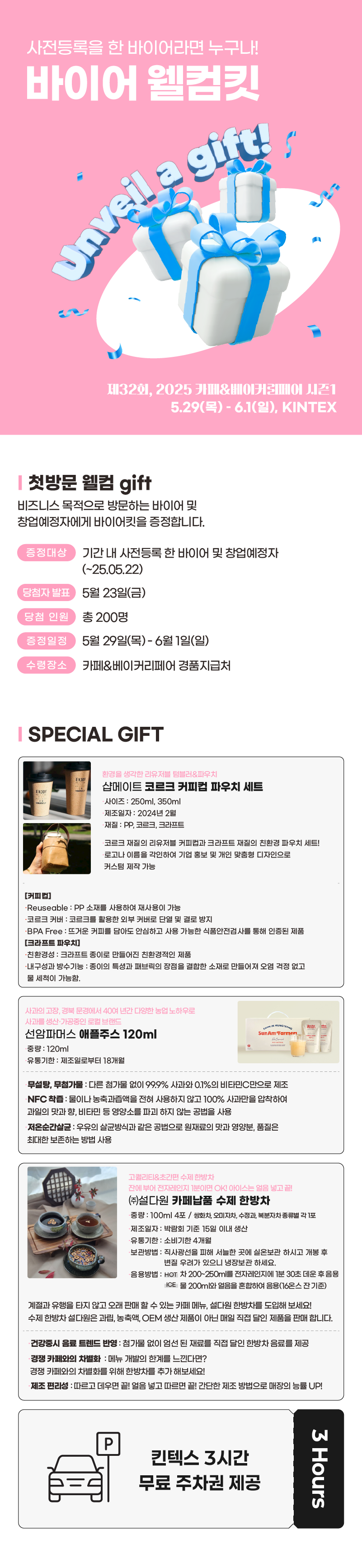 오는 5월 29일부터 6월 1일까지 일산 킨텍스에서 열리는 제32회 카페&베이커리 페어에서는 사전 등록만 해도 다양한 웰컴 선물과 함께 ‘킨텍스 3시간 무료 주차권’까지 받을 수 있는 기회가 주어집니다. 본 글에서는 이벤트 참여 방법과 증정 조건 등을 자세히 안내드립니다.